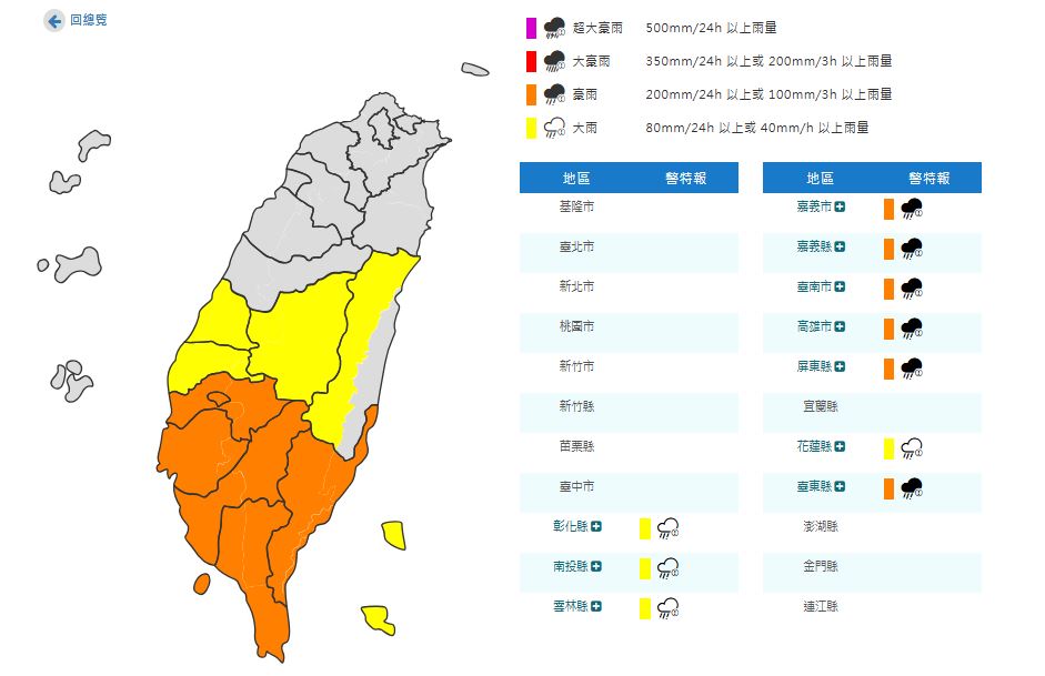 氣象署在今日一早已針對嘉義縣市、台南市、高雄市、屏東縣、彰化縣、南投縣、雲林縣、花蓮縣、台東縣發布豪大雨特報,台南、高雄、屏東更是有機率出現「紫爆」等級降雨,民眾務必慎防坍方、落石及土石流、低窪地區積水,也要留意雷擊及強陣風。