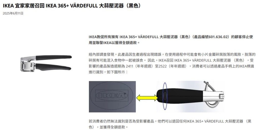 根據媒體《今日新聞》、《ETtoday新聞雲》的報導,IKEA官網在11日發布緊急公告,指出黑色「365+ VÄRDEFULL大蒜壓泥器 (產品編號601.636.02)」因生產瑕疵,導致使用時可能產生金屬碎屑,有混入料理中誤食的風險,為避免健康上的疑慮,因此宣布召回。