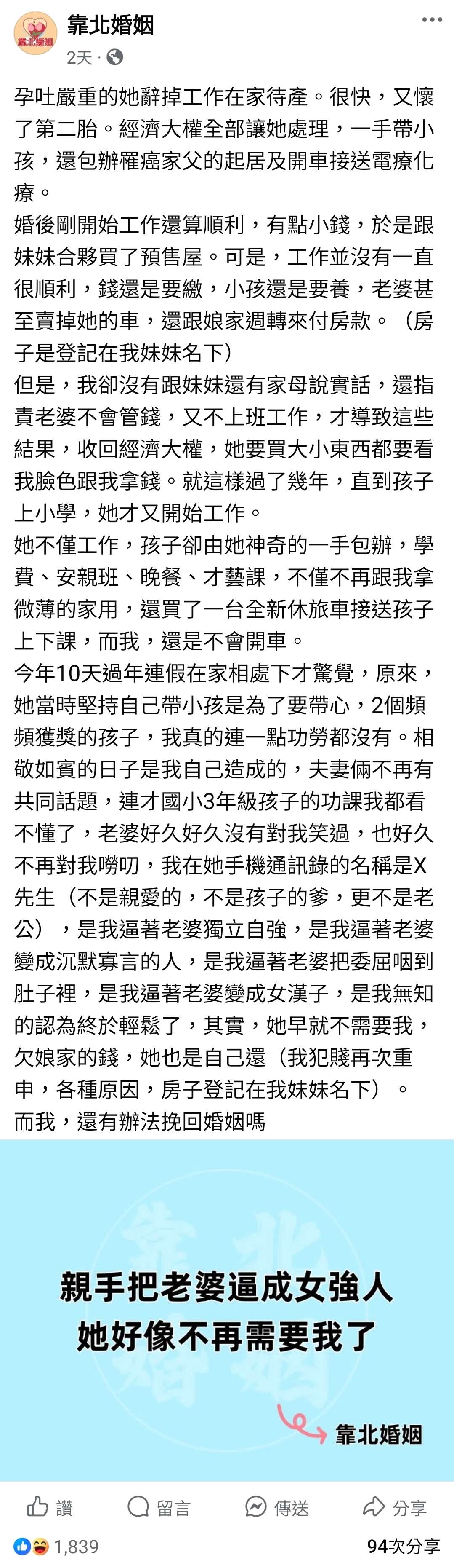 一位人夫上網求助:「還有辦法挽回婚姻嗎?」老婆擔任家庭主婦期間,不只帶2個小孩,還幫忙照顧罹癌的公公。人夫婚後有點錢,跟自己妹妹合資買房,也登記在妹妹名下,但是後來工作不順,「老婆甚至賣掉她的車,還跟娘家週轉來付房款」。人夫認為是老婆不會管錢,收回經濟權,「她要買大小東西都要看我臉色跟我拿錢。」