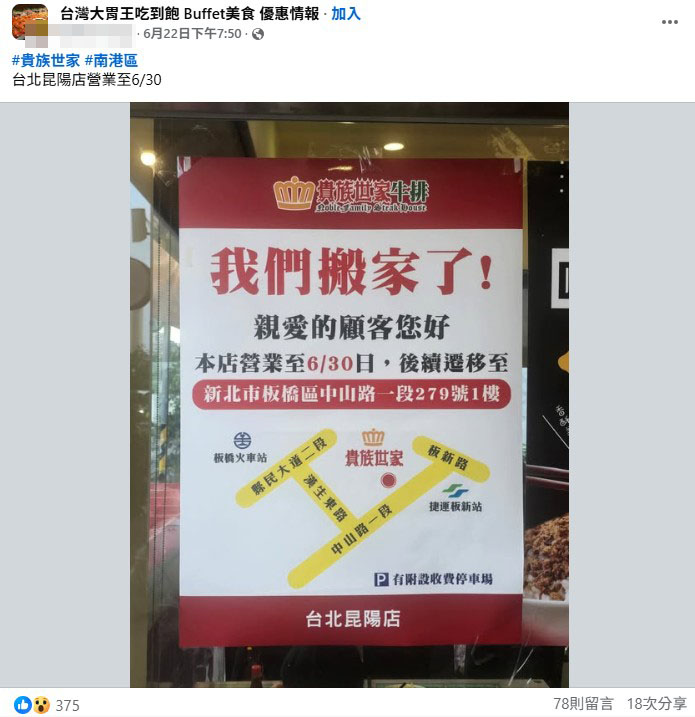 貴族世家台北昆陽店在店門口張貼公告,說明僅營業至6月30日,後續將搬遷至新北市板橋區,鄰近捷運板新站,新址將附設收費停車場。有熱心網友將消息分享至臉書社團《台灣大胃王吃到飽 Buffet美食 優惠情報》。
