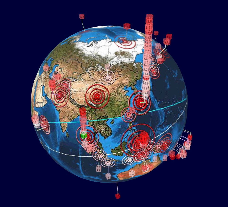 日本最近地震不斷,關於明天 (5) 的末日預言引起熱議。地震監測3D圖「Earthquake 3D」依據美國地質調查局 (USGS) 7天數據,記錄全球震度4.5以上的地震活動,以堆疊方塊的模式呈現。因為日本一週內多次連震,3D圖顯示的方塊層層堆疊、衝破天際,直接在模型上蓋成一座有如宇宙電梯的驚人景象。