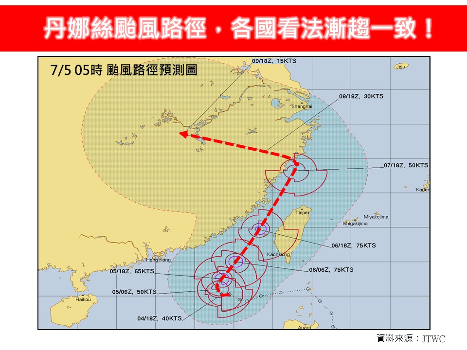 林得恩說明,各國模擬對於丹娜絲的路徑模擬漸趨一致,「中央氣象署官方路徑,是通過台灣海峽北上,且非常靠近台灣的這條;根據過去70年的統計資料顯示,若是走這條路徑的颱風,只占統計總數的15至20%,數量不算多。」
