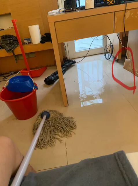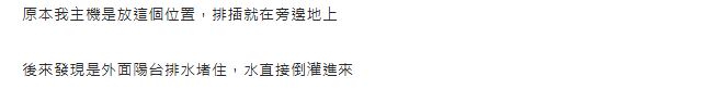 原PO回到家一推開門,驚見他房間竟然淹大水,深度有1、2公分,後來發現原來是陽台的排水孔堵塞,水直接倒灌進屋內。而淹水最嚴重的區域,就是他原本放主機和排插的位置,先前覺得櫃子顏色詭異,就是因為太常倒灌潮濕所致。