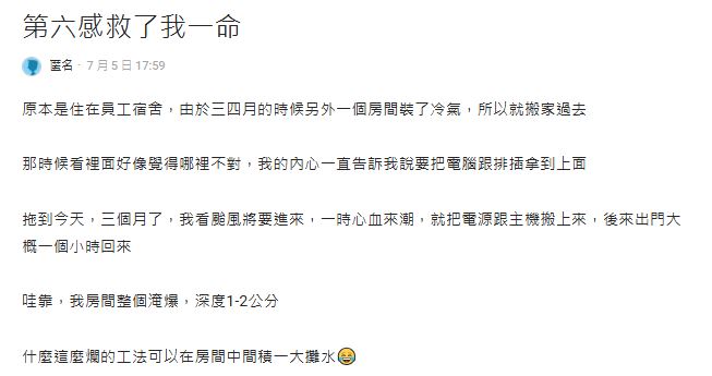 原PO後續清理了快2小時才恢復原狀,但好在他的第六感救了他一命,有事先把貴重物品移至高處,「這樣真不知道該說倒霉還是幸運,如果我電腦掛了應該也沒辦法活了!」