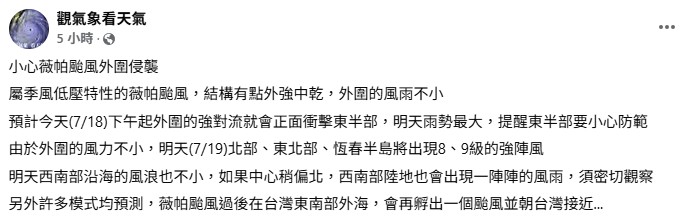 氣象署提醒本週末 (19、20) 戶外活動務必注意安全、調整行程,因為薇帕移動快,今晚到明晨 (18、19) 風雨將明顯增強。本週末東半部、南部有雨,東半部、恆春半島有大雨或豪雨;週六 (19) 花東山區有豪雨以上等級降雨。