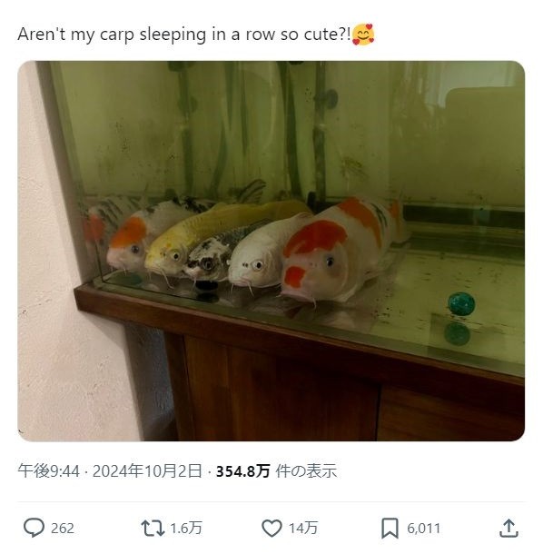 帳號名稱為「@wolflovelove」的網友在X上曬魚,他家5隻彩色錦鯉沿著魚缸底部、靠著牆壁,一隻貼一隻停在水底不動,非常整齊定格在原地。照片吸引超過350萬觀看,很多人好奇錦鯉們發生什麼事:「這5隻鯉魚到底是怎麼樣才能做到如此並排整齊?」