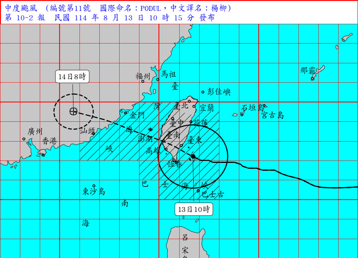 根據媒體《TVBS》、《中天新聞網》的報導,中颱楊柳目前中心位置在台東東南方海面,暴風圈正逐漸進入東部、東南部、及南部陸地,對台東、花蓮、苗栗以南地區及澎湖、金門構成威脅。中央氣象署預估楊柳會在今 (13) 日中午左右從台東一帶登陸,並於傍晚自嘉義、台南附近出海。