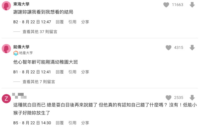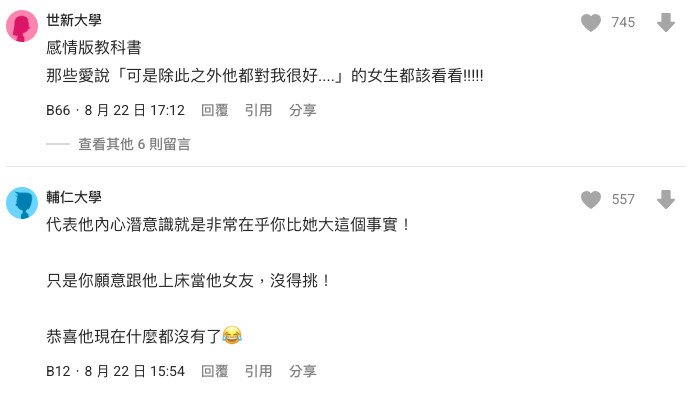 貼文曝光後,一票網友都對原PO的決定相當認可,直呼「謝謝妳讓我看到我想看的結局」、「他心智年齡可能剛滿幼稚園大班」、「就喜歡妳這種乾脆的」、「通常開玩笑說的,就是內心話,藉著玩笑來嫌棄妳,難保哪天遇上年輕的機會,他不會背叛」、「無聊當有趣的屁孩,這下終於得到教訓了」、「差4個月而已基本上就是同齡了吧!他在優越什麼?」、「白目猴子終於得到教訓了!分得好」。