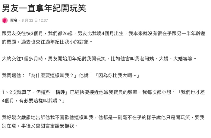 原PO透露,跟男友交往快3個月,兩人都26歲,男友比自己晚4個月出生,本來沒有很在乎跟另一半年齡差的問題,過去也都與年紀小的交往。大約交往一個多月時,男友開始用年紀開原PO玩笑,會叫「老阿姨」、「大媽」以及「大嬸」等等, 原PO曾問「為什麼要這樣叫我?」對方回「因為妳比我大啊!」