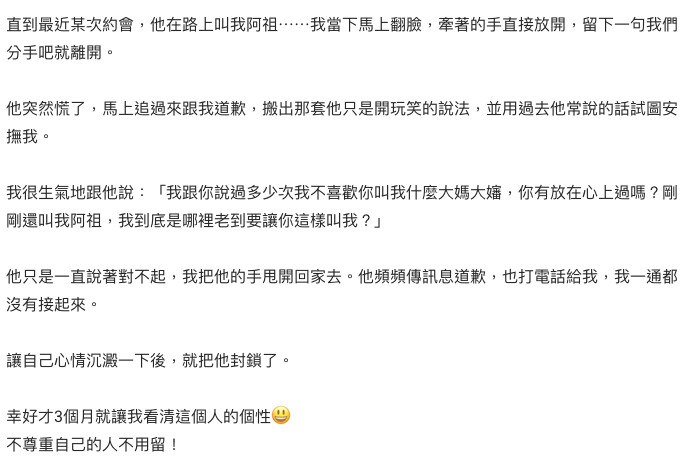 原PO痛罵「我跟你說過多少次,我不喜歡你叫我什麼大媽大嬸,你有放在心上過嗎?剛剛還叫我阿祖,我到底是哪裡老到要讓你這樣叫我?」男友一直說「對不起」,自己把他的手甩開就回家,對方頻頻傳訊息以及打電話來道歉,但完全不想回覆。原PO在心情沉澱完後,就把男友封鎖,「幸好才3個月就讓我看清這個人的個性,不尊重自己的人不用留。」