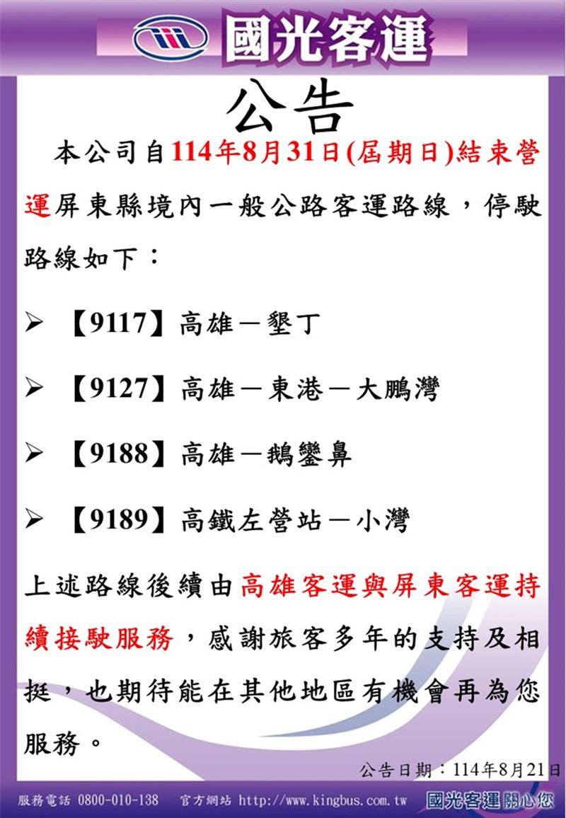 至於國光客運停駛的6條路線,後續將交由高雄客運及屏東客運公司接駛經營,路線營運及服務班次會無縫轉移,以維持基本民行不中斷、服務不受影響,民眾仍可依原需求時段乘車。