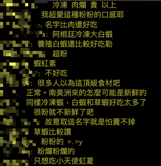 貼文曝光後,一票網友紛紛認同,直呼「冷凍、肉爛、貴,以上」、「名字比肉還好吃」、「養殖白蝦還比較好吃勒」、「不好吃」、「很多人以為這頂級食材吧」、「正常,南美洲來的怎麼可能是新鮮的」、「很粉就不新鮮了吧」、「故意取這名字就是怕賣不掉」、「味很重」、「被取名搞得很像高級食材,然後賣你超貴」、「又粉又腥,超級難吃」、「隨便的白蝦口感就×打了!真心不騙」。
