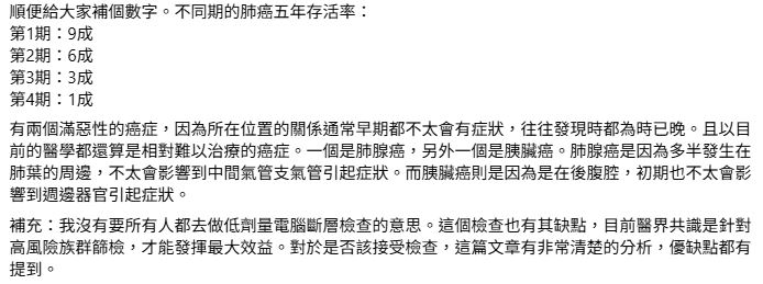 前台大感染科醫師「林氏璧」在粉專發文示警,2013年,台大醫院為全院300位45歲以上的主管和醫師進行了低劑量電腦斷層檢查,竟意外發現有12人罹患早期肺癌,占整體4%,也遠超過台灣肺癌發生率100倍。好在這些醫療人員接受手術後情況穩定,依然健康有活力。