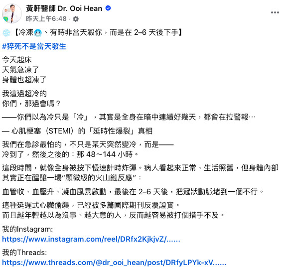 黃軒指出,自己在急診最怕的,不只是某天突然變冷,而是「冷到了!之後的48至144小時,這段時間,就像全身被按下慢速計時炸彈。病人看起來正常、生活照舊,但身體內部其實正在醞釀一場『顯微級的火山鏈反應』。」