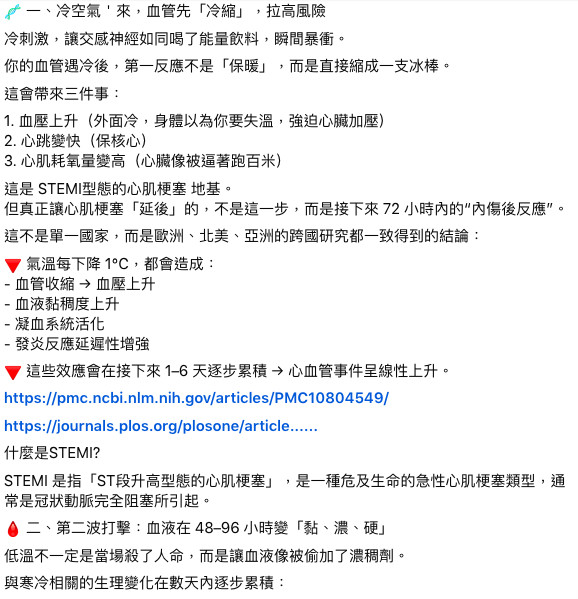 但真正讓心肌梗塞「延後」的,不是這一步,而是接下來72小時內的「內傷後反應」,這不是單一國家,而是歐洲、北美、亞洲的跨國研究都一致得到的結論,氣溫每下降1°C,都會造成: