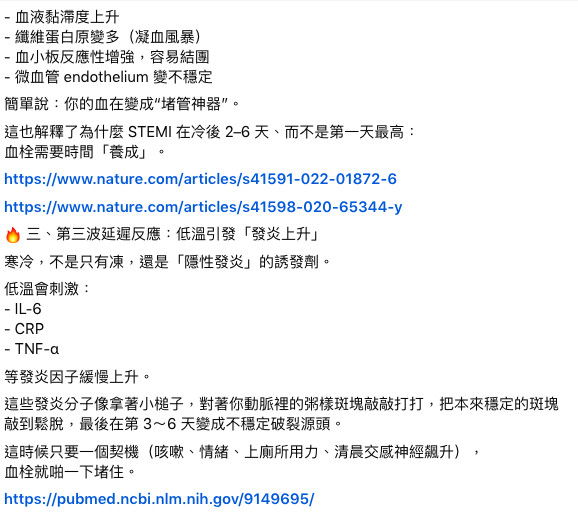 簡單來說,血在變成「堵管神器」,這也解釋為什麼心肌梗塞在冷後2至6天,而不是第一天最高,血栓需要時間「養成」。