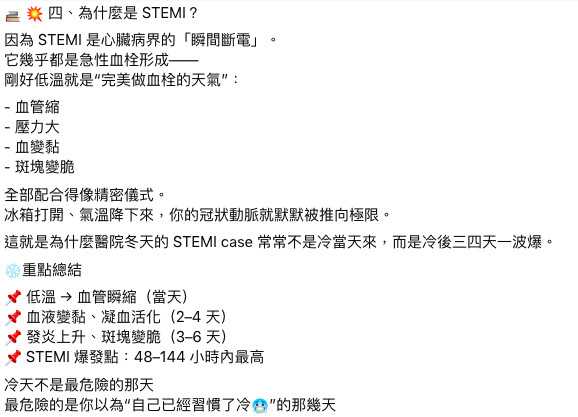 那為什麼是心肌梗塞?黃軒提及,因為它是心臟病界的「瞬間斷電」,幾乎都是急性血栓形成,剛好低溫就是「完美做血栓的天氣」,血管縮、壓力大、血變黏、斑塊變脆等,全部配合得像精密儀式。