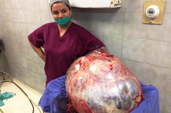 現在醫生也終於能夠親眼目睹這顆重達132磅( 約60公斤 )的腫瘤,幾乎是普通成年女性的體重,而且也只比Talamantes的體重輕4公斤而已!她的醫療團隊認為這是有史以來最大的卵巢腫瘤,也是第一次看到這麼大的腫瘤。