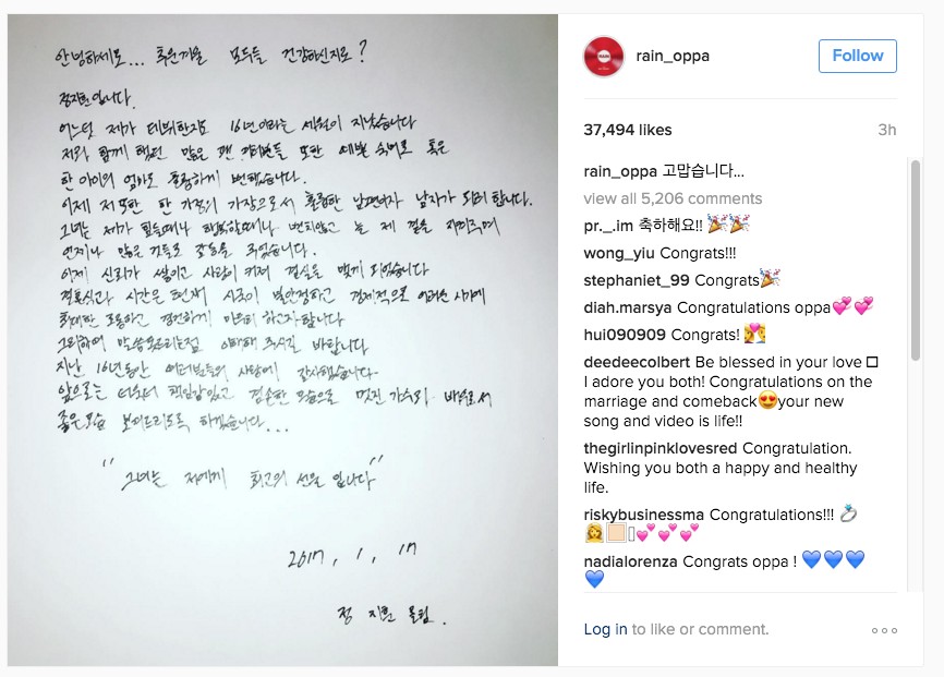 事後Rain也在IG上PO出了親手寫的信,像大家發表「我想要在一個家庭裡,成為一名優秀的男人與老公」,信中也有向女友表示感謝「不論多苦,還是多幸福,她都一直陪伴在身邊,守護著我,讓我非常感動,她是最棒的禮物」!