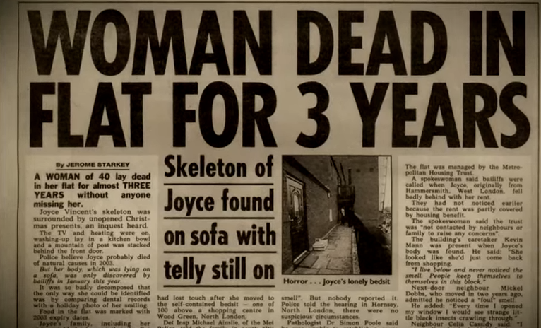 比起恐怖來說,這部片更讓人哀傷。這部片紀錄一名叫Joyce Vincent的女性因為不知名原因陳屍家中,3年後才被發現的故事。她死去時電視還是開著,身旁都是拆開一半的聖誕禮物包裝紙。