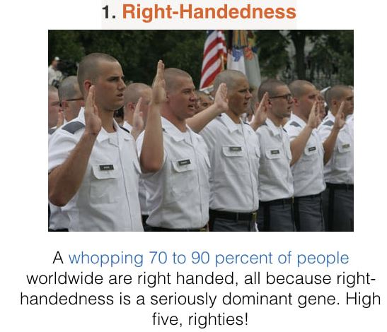 1. 右撇子   全世界有7到9成的人是右撇子,因為右撇子是比較常見的顯性基因。    2. 黑髮   全世界大部分的人擁有黑髮或棕髮。這兩種髮色跟其他髮色比起來是顯性基因。半數以上美國民眾不是黑髮就是棕髮;某些人種有98%是黑髮。 廣告1    3. 耳垂分離   如果你注意耳垂