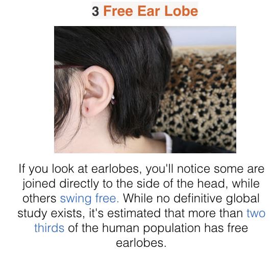 如果你注意耳垂,你會發現有的人耳垂是緊貼頭部,有的人耳垂是和頭部分離的。雖然目前沒有有關這方面的全球研究,但預估有超過2/3的人類耳垂是分離的。
