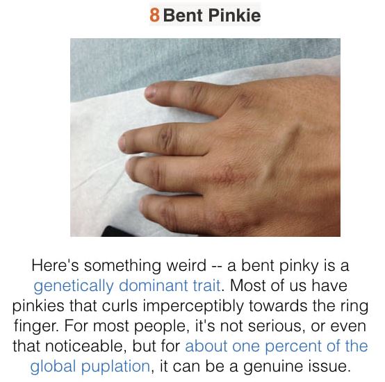 這就有點奇怪了:小指彎曲是一種顯性基因。我們大多數人的小指都些微彎向無名指。對大部分人來說,這不是什麼嚴重的問題,也不是那麼容易注意到。但對全球1%的人來說,這是個基因問題。