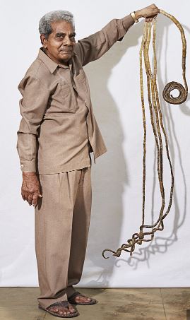9. 有些人喜歡留指甲,但竟然有人留了很多很多年,像這位印度的78歲男子Shridhar Chillal 就有著非常長非常長的指甲。現在已經有一共909公分的指甲在他手上,他的大拇指的最長2公尺,中指是186公分。