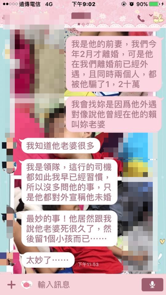 原PO表示,她用臉書找小三後,小三卻回她,「最妙的是,他居然還跟我說老婆死很久了,留一個小孩而已。我知道他老婆很多,我是領隊,這行的司機都如此,我早已習慣,所以沒多問他的的事…」
