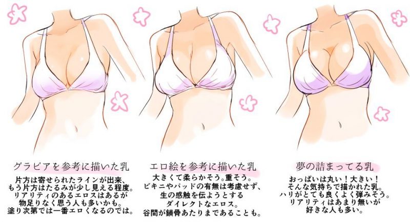 1. 有一點凹的胸部:只要在一邊畫一條線,然後讓另一邊的胸部比這條線還要低。雖然他們看起來很真實,但對某些人來說也不是完全真的。需要看他們是怎麼上色的,說不定這是最性感的一種?