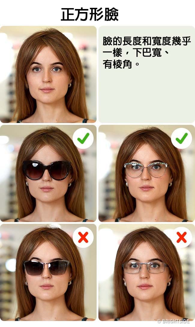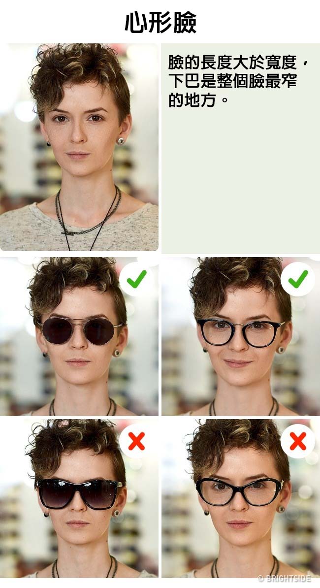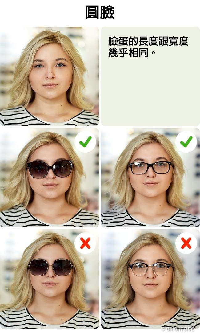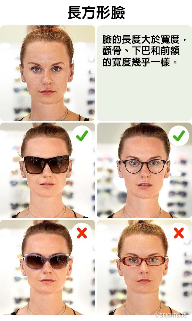 適合的眼鏡:光滑的框架、蝴蝶型、貓眼型或飛行員。不適合的眼鏡:太跨張、太橫、窄的框架。