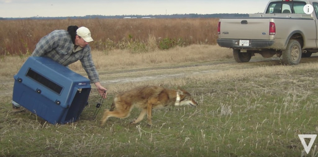 沒想到這隻狼只是想跟他們家的狗玩,看著兩隻玩了一陣子後,Nick鼓起勇氣走出來看。發現這隻狼真的只是想要跟狗玩。