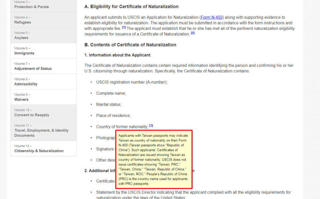 國土安全局 (Department of Homeland Security) 網站上的「歸化證書(Certificate of Naturalization)」規則註明,持有台灣護照的申請者在申請入籍時,可以指定用「Taiwan」當國籍,未來申請人收到的歸化證書上,原先的國籍也會顯示「Taiwan」。此外,美國國土安全部表示,未來發出的入籍書上不會再出現「Taiwan, PRC」、「Taiwan, China」、「Taiwan, Republic of China」或是「Taiwan, ROC」等字眼。