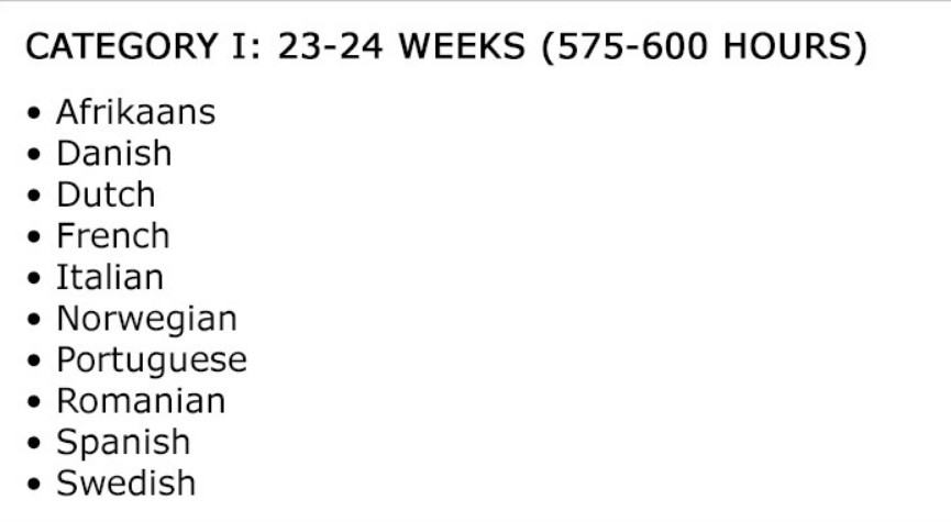 第1種語言是屬於羅曼語族,基本上是由拉丁文來的,所以英語系人士會比較容易上手,包括像南非語、丹麥語、荷蘭語、法語、義大利語、挪威語、葡萄牙語、羅馬尼亞語、西班牙語和瑞典語等。這些語言大約需要花23-24周學習。