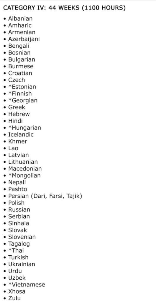 第4種語言就很多了,需要44周,也就是快1年才學的起來,包刮阿爾巴尼亞語、阿姆哈拉語、亞美尼亞語、阿塞拜疆語、孟加拉語、波斯尼亞語、保加利亞語、緬甸語、克羅地亞語、捷克語*、愛沙尼亞語*、芬蘭語*、格魯吉亞語、希臘語、希伯來語、印地語*、匈牙利語、冰島語、高棉語、寮國語、拉脫維亞語、立陶宛語、馬其頓語*、蒙古語、尼泊爾語、波蘭語、俄羅斯語、土耳其語、泰語*、越南語*……好了太多了小編累了 (汗) 有打星號*的就是第4種語言裡又更難一點的語言。