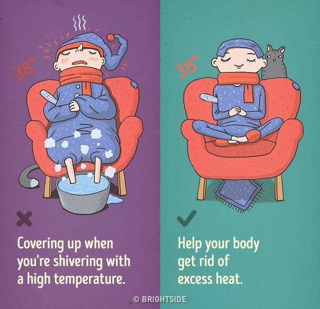 當你生病發冷的時候會發抖,發抖的同時又感覺到很熱的話,那代表你的體溫正在上升中,只是當你穿更多想要保暖時,那麼體溫只會上升更快。雖然熱量可以幫助我們抵抗一些感染,但是當體溫高於38°C時對身體還是不好的。當體溫過高時是需要降溫,而不是升溫。