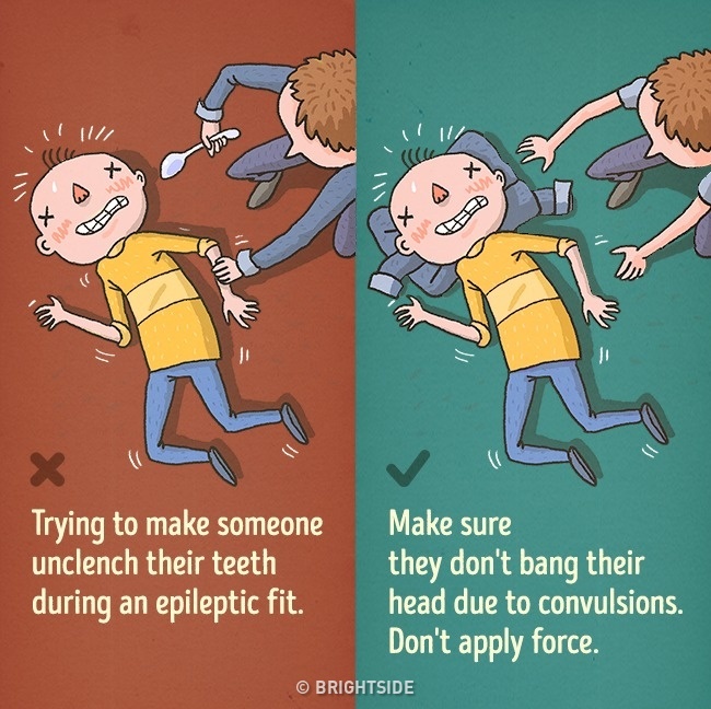 你如果把東西放進他的嘴裡,可能會傷害到他的牙齒,大多人都會怕他的咬斷舌頭,但實際上他們只會輕咬一下,並不會造成太大傷害。當你碰上癲癇患者時,可以在他頭下墊一些軟的東西,避免他們在痙攣時腦部撞擊到地板;當他們停止痙攣後,可以將他們身體轉成側身。