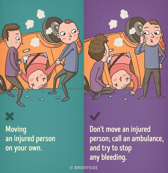 如果路上看到車禍,不要移動受傷的人,也不要試圖將他們拉出車外,因為你可能會造成他們二度傷害,除非車子正在起火這種逼不得已的情況。不然你應該要:叫救護車、關閉車子引擎及切斷電池電源、止血、幫助受傷的人保持冷靜。