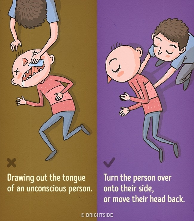 昏迷的人直接背朝地躺著是很危險的,因為舌頭可能會堵住他們的呼吸道,但是解決方法不是將他們的舌頭拉出來,而是幫他們轉成側躺,或是移動頭部即可。
