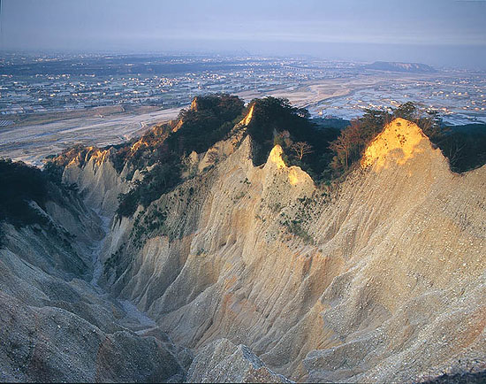 據了解,位於苗栗縣三義鄉、苑裡鎮交界的火炎山,是經過劇烈造山運動而隆起,主峰海拔596公尺、北峰海拔614公尺,為臺灣小百岳之一,岩層主要由厚層礫石與薄層砂岩組成,因黏著力不佳,在風化、雨水侵蝕作用下被沖刷切割得支離破碎,因此形成尖銳山峰和卵石滿山谷的景象。