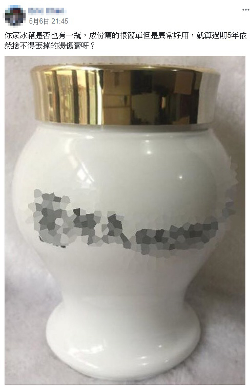 每個人在家中一定都會放些備用藥品,在出現狀況時才能應急使用。日前在臉書《爆廢公社》就有網友貼出一罐白色瓶子、金色蓋子的燙傷膏,並問大家「你家冰箱是否也有一瓶?」立刻引起迴響。