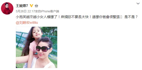 藝人劉畊宏和王婉霏的女兒小泡芙 (劉宇芙) 因前陣子出演陸綜《爸爸去哪兒5》,可愛的模樣讓她有著無數的粉絲,只是在節目播出完結篇後,大家都只能等著劉畊宏夫妻更新照片,才有辦法再看到小泡芙近況。就在26日時,王婉霏終於在微博曬出一張母女合照,並且寫下擔心的文