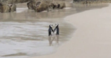 放閃無誤!沙灘上夫妻企鵝牽手漫步 「手勾手黏緊緊」太甜蜜♡