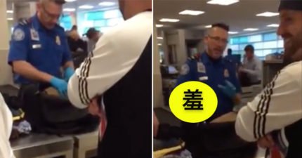 安檢人員發現行李裡有異狀時立刻打開檢查,但當他「一抽出跟著水瓶綁在一起的東西」時整個網路就全都臉紅笑炸了!
