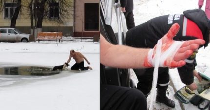 狗狗「跌入冰池爬不出來」快凍死,戰鬥民族大叔直接「霸氣讓他咬手」爆血救上岸!