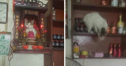 他一抬頭看到這景象差點嚇壞,網友笑說:「舉頭三尺有貓咪!」