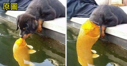 他拍到狗狗与鱼「超有爱的亲亲画面」 网友却开始P图大赛:这绝对是世纪之恋!