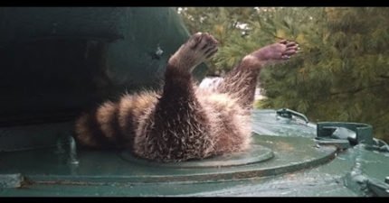 好奇心过强的浣熊太胖卡在坦克车上,救出后「就变忍者了」。