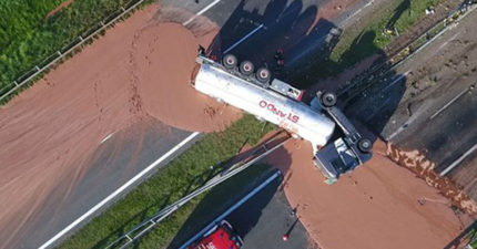 貨車公路上翻覆「24噸巧克力瞬間湧出」!網友:《巧克力冒險工廠》翻版