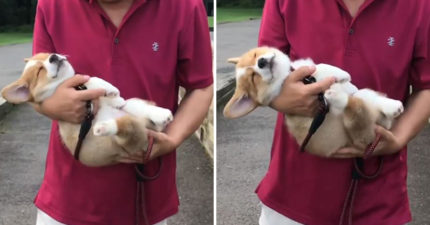小柯基散步途中「累到睡翻」 主人無奈「嬰兒抱」融化全網❤